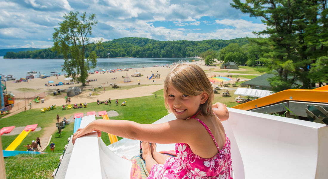 Petite fille sur un toboggan dans l'aire de jeux de la plage du Lac Simon