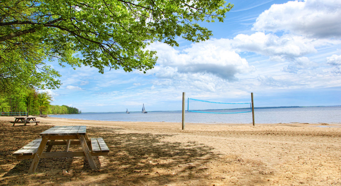 Plage au parc national d'Oka avec un filet de volley et une table de pique-nique